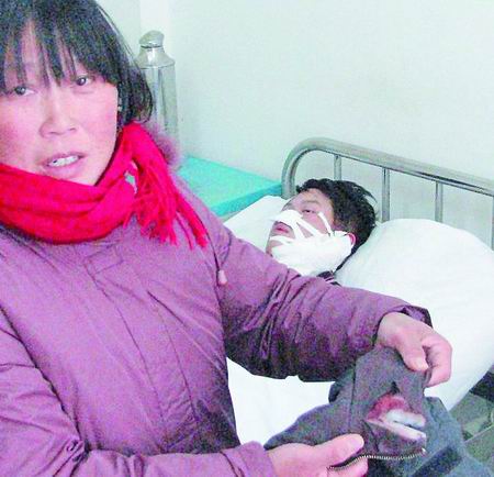 记者看到,这件灰色棉袄袄领左侧被砍破,内侧的鸭绒露了出来。破裂的袄领处,已被鲜血凝固。