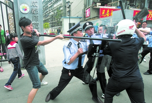 学校校门内,一群小学生正排队准备放学,一名戴着头盔、手持菜刀的男子突然冲向校门,危急时刻,3名持盾牌的保卫人员和两名拿棍的男老师组成“人墙”,将男子拦在校门外,男子数次冲击校门均被挡了回来。1分钟后,接报而来的民警将男子制服……
