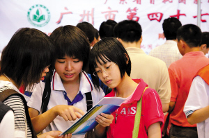 在广州市旅游商贸职业学校的摊位前,由于学校带来的1万份材料都发放完毕,该校副校长、就业办主任、教务处负责人“全员出动”,给前来咨询的学生、家长作“口头宣讲”。校方讲得卖力,家长也记录得起劲。