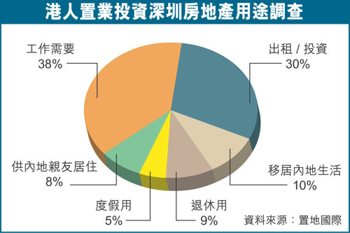 报告指出,去年港人在深圳购置物业约8,300至8,500单位,大增36%。港人因工作关系在深圳置业比例近年持续上升,由01年的11%,增至04年起连续多年超越3成,去年更连续两年高达38%,成为港人深圳置业的首要原因。此外,买楼收租亦成为港人于深圳置业的主因之一,数字由01年的16%,增长至06年的29%,07、08年受内地宏调影响,虽然一度下跌至21%,但随政府放宽限外令等政策,去年已升至30%水平,创历年新高。与此同时,港人购买深圳物业作度假及退休用途的比率则下调至14%,八年来减少43个百分点。