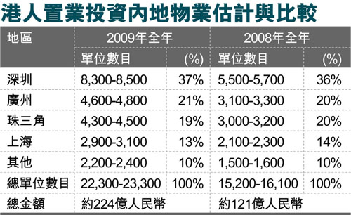 据香港《文汇报》报道,置业国际集团主席蔡涯棉表示,09年内地楼市在政府保八政策、内地经济持续增长及中央采取宽松货币政策等因素下大幅增长,而放宽第二套房按揭政策更吸引投资者重新进入楼市,成交及价格均大幅上升。他预期今年全年港人购买内地单位数目,将增长至2.52万至2.62万个,金额达252亿元,较去年同比增13%及12%。