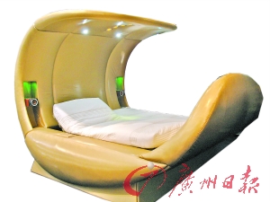 最引人注目是这款价值20万元的大床,整张床就像卷起的舌头呈半包围状,一头装着电视,排骨架可随意调节高度,床里装有震撼的木制音响,据说表面是一种特别像真皮的布料,可以起到防辐射效果。因为造型怪异,还真吸引不少人拍照留念。