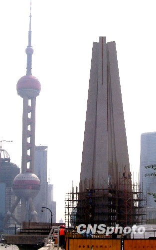 9月11日,工人们从上海外滩整修后的人民英雄纪念碑拆除施工脚手架,露出整修后新面貌。中新社发 周东潮 摄