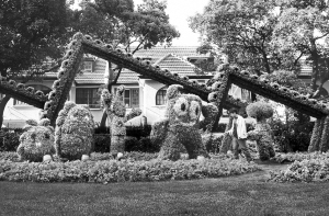 世博会日益临近,上海街头的迎世博氛围也越来越浓。在北京西路胶州路口,“亲如一家”绿化景点现身在近1000平方米的绿地里。来自1998年葡萄牙里斯本世博会的吉祥物“吉儿”(中)、2005年日本爱知世博会的吉祥物“森林爷爷”和“森林小子”、2008年西班牙萨拉戈萨世博会的吉祥物“水生物”(右)与海宝欢聚一堂,欢迎五湖四海的朋友。(孙中钦)