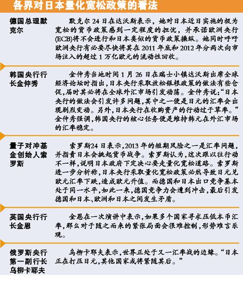 24日,德国总理默克尔在参加冬季达沃斯世界经济论坛时表示,“我必须承认我对日本存在一些担忧。”26日,韩国央行行长金仲秀在达沃斯表示,日本央行采取放松银根政策的做法有些仓促,届时其必将在全球外汇市场引发动荡。
