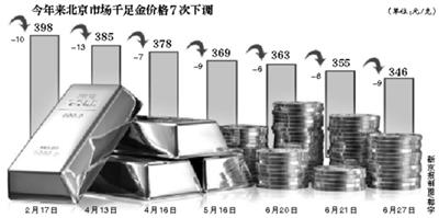 此外,北京太阳金店从昨日起,黄金饰品价格下调至346元/克,会员价为341元/克,下调幅度为每克4元。