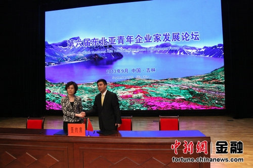 邮储银行吉林省分行副行长朱记荭与共青团吉林省委副书记刘铁铎在第六届东北亚青年企业家发展论坛开幕式上共同签订了“团银贷”金融服务合作协议。