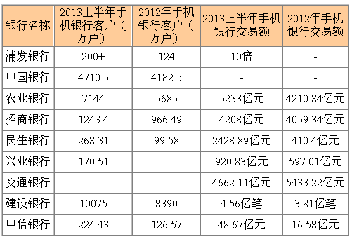 上半年,各家银行在手机银行领域持续发力,用户数量、交易规模较2012年均有大幅提升。其中,工商银行、建设银行用户突破一亿规模,成为拥有网上银行和手机银行“双亿级”客户群的银行。浦发银行上半年个人手机银行交易金额为去年同期的10倍,工商银行更是达到11.6倍之多。