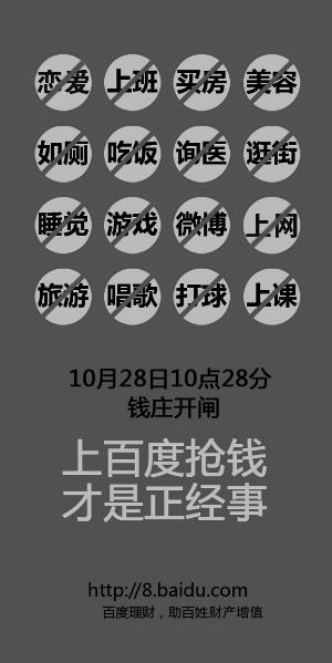 10月28日,备受金融界、互联网界以及广大网民关注的“百度金融中心——理财平台”正式上线,百度携手华夏基金在其理财平台上推出首款理财产品在首日即全部售罄,当日销售额突破10亿元,创造了基金市场的新纪录。百度理财平台首款支持产品的火爆程度甚至超过即将到来的双11抢购,业内人士认为,这场网友“抢钱”大战的背后实际上是开启了全民互联网理财的盛宴。