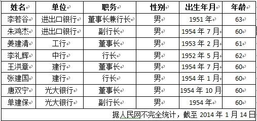经过人民金融不完全梳理发现,目前在我国银行高管中,年龄超过或接近60岁的有7位。其中,进出口银行董事长兼行长李若谷63岁,中国银行行长李礼辉62岁,工行董事长姜建清61岁,建行董事长王洪章60岁,建行行长张建国60岁,光大银行董事长唐双宁60岁,光大银行副行长单建保60岁。