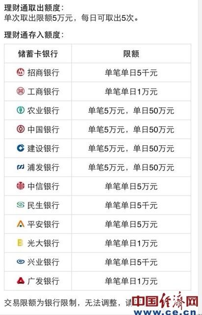 中国经济网记者观察到,各家银行对于理财通的限额不一。农行和建行最为豪爽,单日转账限额可达50万元。而经过调整,工商银行、中国银行、浦发银行则对理财通进行了紧急拉闸处理。工行从没有月度限额调整为单月最多5万,中国银行从单日50万下调至单日49999,浦发银行从单日50万变成了单月最多10万。