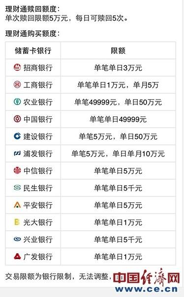 在本网报道招行限额较低之后,其在第二天立即上调限购金额,从5000升至3万。银行业内人士表示,招行零售客户较多,相比其他股份制银行,客户对理财通的需求较高,提升额度也可以为持卡人提高效率。