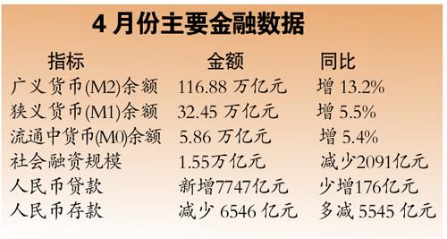 4月末,广义货币(M2)增长13.2%,狭义货币(M1)增长5.5%。当月人民币贷款增加7747亿元,少于此前市场的预期。