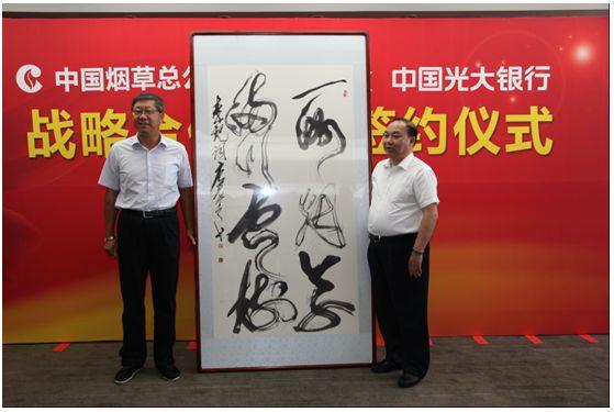 战略合作协议签署后,中国光大集团董事长唐双宁向中国烟草总公司赠送了其书法作品《一洲烟草 满川云树》,寓意中国烟草总公司立足九州、誉满天下,银企双方合作前景远大、美好。