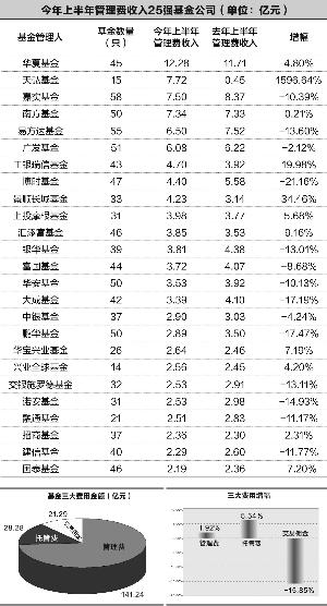 半年报显示,基金公司上半年合计收入管理费141.24亿元,同比小幅增长,但剔除掉支付给渠道的尾随佣金,净管理费收入只有117.64亿元。华夏基金以12.28亿元收入依然是管理费最高的基金公司,天弘基金、嘉实基金、南方基金和易方达基金位居第二到第五名,广发基金、工银瑞信、博时基金、景顺长城基金和上投摩根基金排名管理费收入第六到第十名。和去年同期相比,可以的72家基金公司中有44家管理费收入下滑,占比达到61%。一些大型基金公司管理费收入缩水超亿元,个别小公司管理费缩水幅度达到62%。