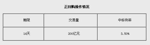 中新网10月9日电 据中国人民银行网站消息,人民银行于本周四(10月9日)以利率招标方式规模为200亿元的正回购操作。此次正回购中标利率为3.50%,期限14天。(中新网金融频道)