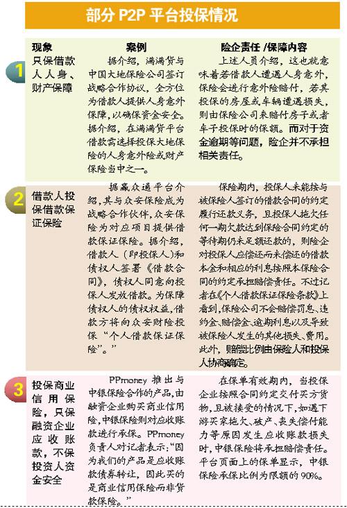 为让投资人安心,部分P2P平台大张旗鼓挂出了“保险公司承保”、“与保险公司合作”等说法,明示或暗示旗下P2P产品的安全性较高。但记者调查发现,由于贷款保险保费贵,赔付比例低,大部分P2P平台购买保险或与保险公司合作,并不能在出现兑付危机时给予还款保障,部分甚至只能保证借款人人身、财产安全。