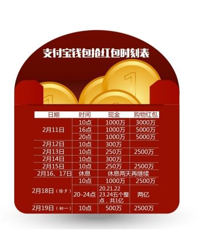 支付宝钱包方面透露,2月11日至2月19日期间,将在14个整点时间发放现金红包。根据规则,抢红包在上述14个整点开始,每次持续半个小时。同一用户每一个时间段只能参与一次。