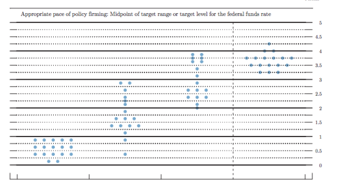 (数据来自美联储:点阵图的中位数显示,2015年内联邦基金利率将升至0.625%的水平)