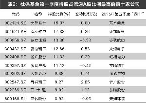 第一季度社保基金持股占流通A股比例最高的前十只股票持股比例都在8%以上,其中,春兴精工、卫士通、天翔环境、富临精工、省广股份、春秋航空被增持,天邦股份被持平,巨化股份、我武生物、东方能源被减持。持股比例最高的是天邦股份。持股比例增加最多的是春兴精工,持股比例增加2个百分点以上。和2015年第四季度相比,天邦股份、春秋航空、东方能源、富临精工、省广股份、我武生物、天翔环境共7只股票维持“前十”的位置。春兴精工、卫士通、巨化股份新入围。