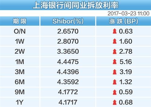 经济日报北京3月23日讯 记者张忱报道:23日资金面延续本周以来的紧张态势。上海银行间同业拆放利率(Shibor)连续3天全线上涨。