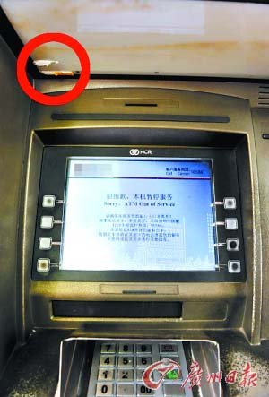 昨日下午,记者来到何先生所指的中国银行营业部,银行门口外侧有两台ATM机,左侧的一台有多位市民正在排队取款,右侧一台屏幕上显示着“本机暂停使用”。从外表看这两台ATM并没有什么异常,右侧提示故障的一台机器的银行卡入口有明显的粘胶痕迹,而左侧一台的银行卡入口则有用于保护的鸭嘴形塑料套。记者抬头看到,在银行门口不足十米的距离内,安装有四个监控探头,其中两个分别对着两台柜员机。