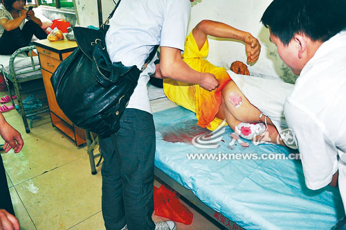 记者来到高安市人民医院住院部,见到了躺在病床上输血和输液的高祖发。医生说,高祖发臀部中了两刀,其中一处靠近肛门,深达10多厘米,伤口容易被感染,另外还失血过多,有脑震荡迹象,尚未脱离生命危险。