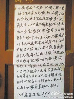 昨日,网友@蓝海UFO把这张照片发到网上,并@燕赵晚报官方微博,引来众多网友的围观,网友们纷纷谴责小偷的恶行。“老人的钱你竟然也好意思偷。”“看完这封信我替小偷脸红。”“小偷可恨,但咱也要从自身找找原因,干吗让贼偷三次啊?亡羊补牢,做好自家的防盗。”