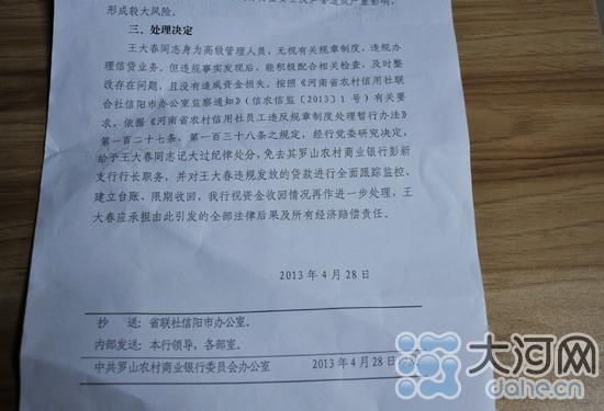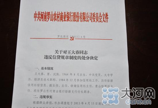 22日下午,罗山农村商业银行一位不愿意透露姓名的工作人员称,王大春已被免职,并提供给记者一份名为《关于对王大春同志违反信贷规章制度的处分决定》的文件。