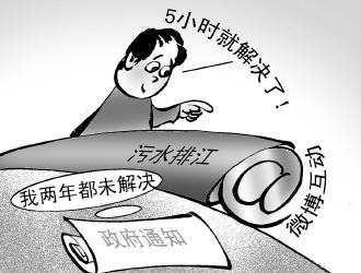湖南邵阳化工企业污水直排资江,政府下文两年无法关停。然而,此事经公益名人微博转发后,很快得到省环保厅官员响应,不到5小时,排污企业被停产整治(7月4日《潇湘晨报》)。