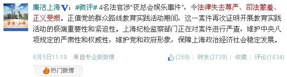 5日中午,上海市纪委市监察局官方微博“廉洁上海”,就上海高院4名法官涉“夜总会娱乐事件”发表“微评论”:令法律失去尊严、司法蒙羞、正义受损。
