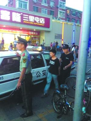 昨晚7时许,京客隆超市三里屯店发生一起命案,一名保安在超市内被人捅死,随后凶手被警方押走。
