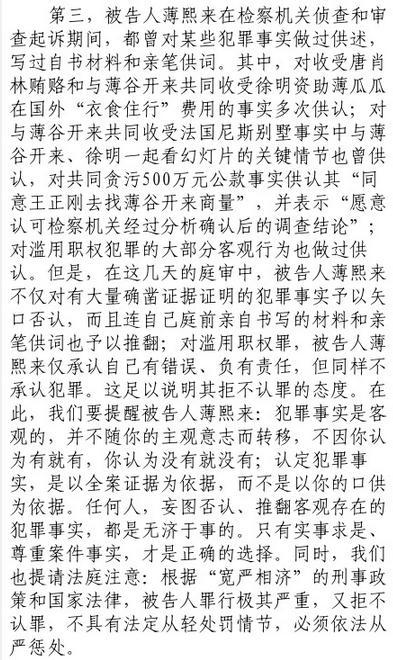 公诉人:薄熙来拒不认罪必须依法从严惩处
