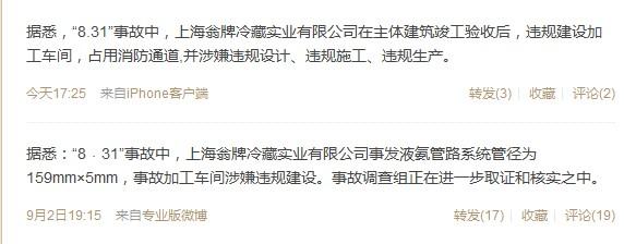 据上海市安全生产监督管理局官方微博 @上海安监 “8﹒31”事故中,上海翁牌冷藏实业有限公司事发液氨管路系统管径为159mm×5mm,事故加工车间涉嫌违规建设。该公司在主体建筑竣工验收后,违规建设加工车间,占用消防通道,并涉嫌违规设计、违规施工、违规生产。