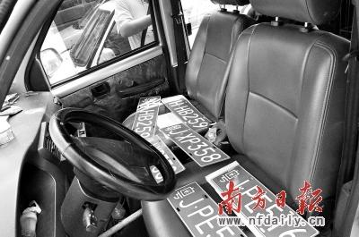 三车合围逼停盗车贼(上),车内缴获6副假车牌(下)。 张忆 摄
