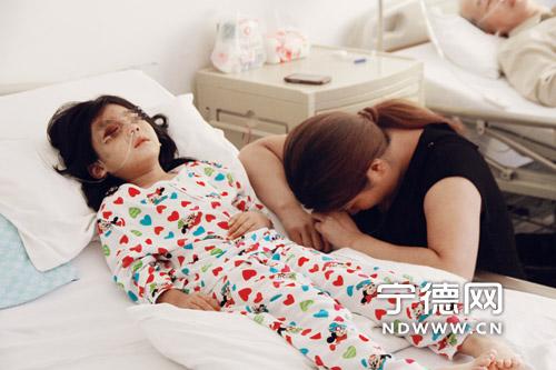 病床旁小美的母亲钟女士和小美的奶奶正在一旁照顾她。小美在失声痛哭数分钟后,情绪稍稍安静下来。记者注意到,小美右侧脸部水肿严重,眼圈淤青,右侧脸颊以及右侧额头头皮出现了许多“焦皮”。