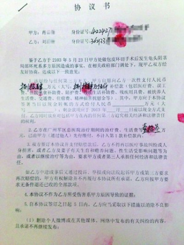 协议上称,补偿款支付后,刘先生不得再以医疗事故纠纷或人身损害、有关生育和赡养问题、性生活受影响问题或继续治疗为由等,要求肖先生承担任何经济和法律责任,如果刘先生又投诉、举报或起诉,就必须退还已收款项。