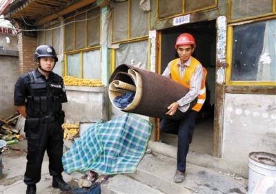 在法警监督下,被执行人屋内的物品被搬出。日前,房山一村民以儿子不孝,起诉对方腾房胜诉后,向法院申请强执。昨天,该案执行完毕。新京报记者 韩萌 摄