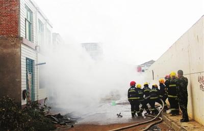 消防队员及时赶到现场,进行稀释降温。记者 剡文鑫 摄
