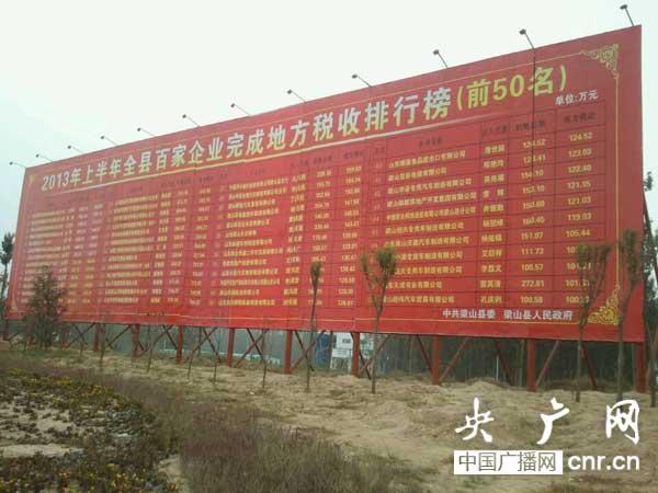 2013年上半年梁山县企业纳税排行榜就立在拳铺镇的路边(央广网记者 肖源 栾红 摄)