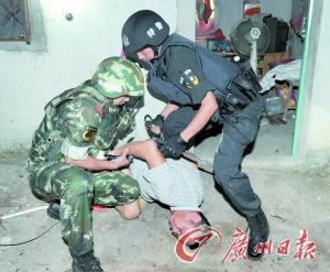 10月9日凌晨2时,所有行动小组车辆换成地方牌照,各自奔赴目的地。4时,惠东白花镇,一条窄得无法会车的乡间小路,伸手不见五指。突然,一道刺眼的亮光出现,一队全副武装的武警手持铁锤开始砸铁门,砸了两下门没开,便搭人梯翻墙,冲进院内,一脚踹开大门,几乎还没看清是怎么回事,两名手持微冲的武警和一名持手枪的警察将一男子摁倒在地,“蹲下,不许动!”其余警力立即包围院子,防止疑犯逃脱。整个过程不过几秒钟。