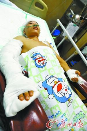 昨日,在番禺区中医院,阿平身上的伤口已缝上,头上有三处约10厘米的伤口,右手的伤口长约20厘米,“头骨骨裂,马上就要去动手术。”阿平的妻子哭着说。