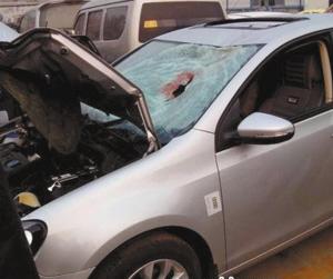 ■肇事车前挡风玻璃被撞了一个大洞,上面鲜血淋漓。