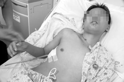 今年14岁的小新,是临高某学校的一名初二学生。11月5日晚上9时许,小新和另外两名同学上完晚自习,离开学校准备回出租屋休息。不料,三人刚走出校门没多远,就被两名黑衣男子拦住索要钱财。两名同学见势不妙拔腿就跑,而没来得及跑开的小新被歹徒围住,被捅三刀、被砍一刀,当场昏迷过去。昨日,记者在医院看望小新时,他的肺部仍插着管子,身体十分虚弱。