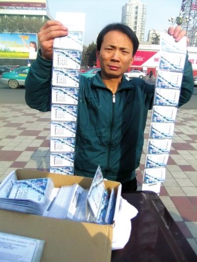 12月12日,记者在东方红广场见到了吕先生。他手中拿着一盒电话充值卡,面值从50元到100元不等,卡上印有“中国联合通信”和“中国移动互联网”等字样。充值卡的纸张很软,与正规充值卡区别很大。据吕先生介绍,12月7日,他在58同城网上找工作时,一则电话充值卡打折信息引起了他的注意。他与对方取得联系后,对方称,1.5万元的充值卡只需掏5800元就可以拿到。当吕先生质疑真假时,对方说,可以先交200元定金,然后把货发过来。但当吕先生收到充值卡后试用时,却发现无法充值,而对方却回答说钱付清后会立即解冻。就这样,吕先生按照对方要求5次汇出了5800元,之后收到了快递送来的1.5万元充值卡。但是,吕先生多次试着充值都无法完成。他打电话询问时,对方称可以退货,但必须再交1800元的违约金。此时,吕先生才感觉自己上当受骗,于是拨打110报警。(首席记者孙建荣文/图)