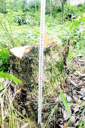 在盗砍者手中,五株几十年树龄的楠木倒下,留下五截光秃秃的树根,触目如大山留下的疮疤。