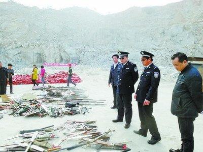 警方集中销毁收缴的非法管制刀具、仿真枪等。