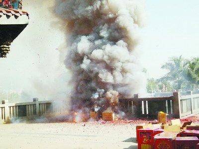 收缴的非法危爆物品烟花、爆竹销毁现场。