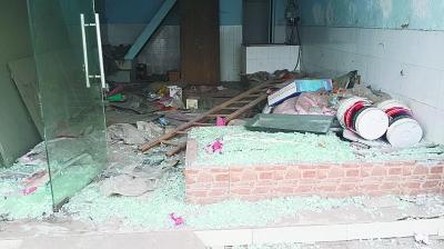 当天下午3点钟,记者来到位于临江大道193号至197号的事发现场看到,黄师傅的修理厂几近被搬空:接待间中除了一个顶部安放有“财神爷”的办公柜之外,其他的家具全部被拖走,而修理间的地面上则满是颗粒状的橱窗玻璃碎片。