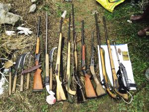 靠近面包车后民警发现,车内挤满了人和狗。要求车上人员下车接受检查时,几人突然四散而逃。民警现场控制了4人,另有6人趁机逃走。在随后对车上物品进行检查时,民警发现,车辆后座位上放着一堆自制火药枪。经清点,共有自制火药枪10支、军用子弹5发、自制猎枪子弹7发、柴刀5把、匕首2把。
